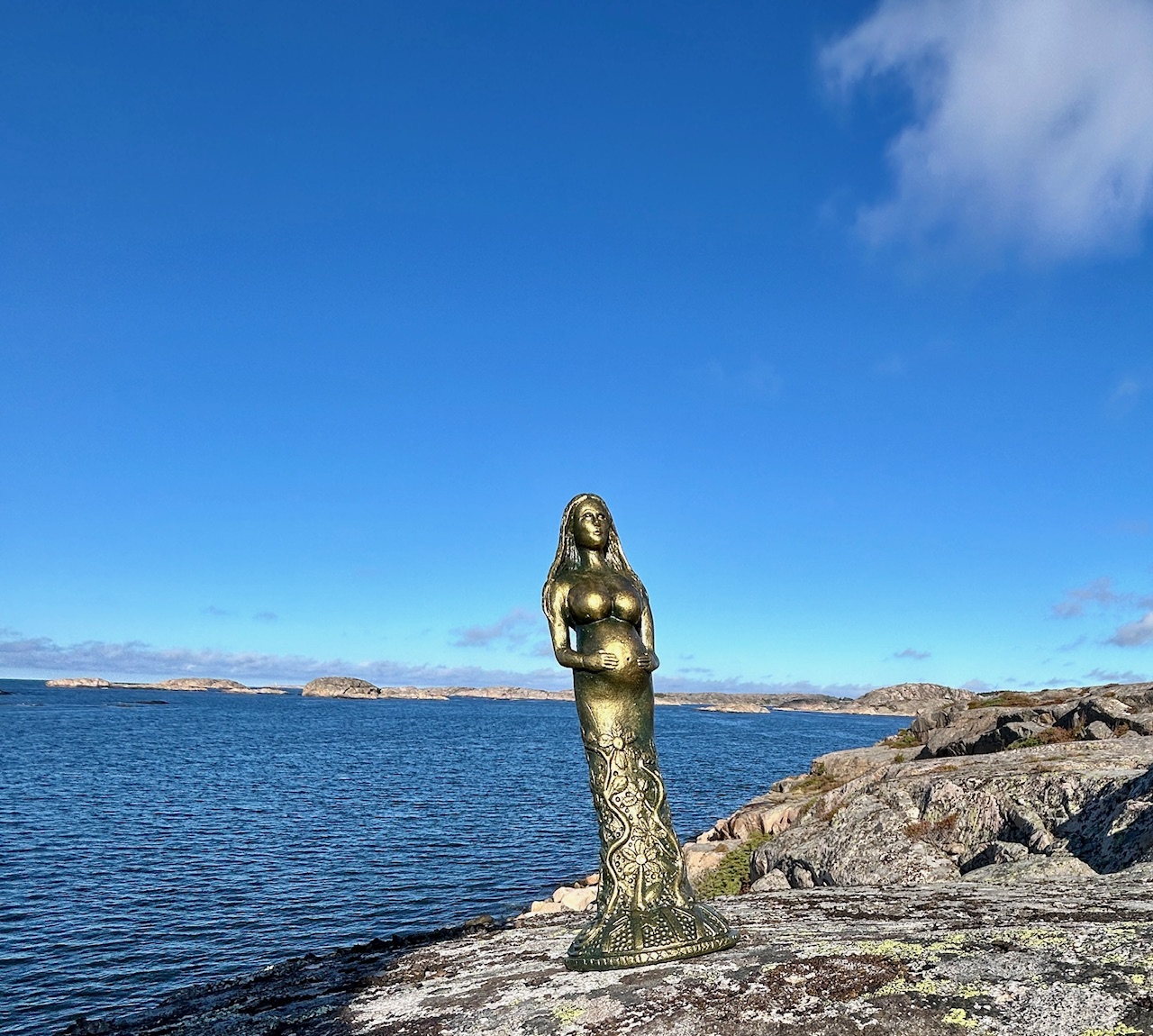 I have depicted her as a pregnant woman, symbolizing fertility and creation, while also holding the Earth in her hands. The runes on the base spell “Friga.”